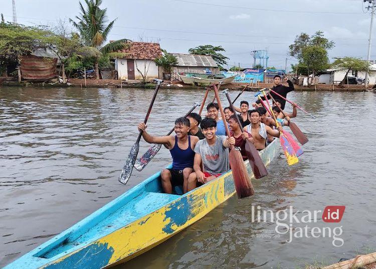 Para atlet dayung Desa Mulyorejo, Kecamatan Tirto, Kabupaten Pekalongan menjadi relawan banjir sekaligus berlatih pada Minggu, 8 Februari 2026. (Fahri Akbar/Lingkarjateng.id)