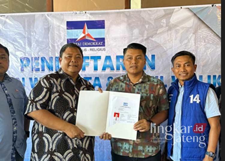 Dalam foto tersebut, terlihat Ade Bhakti bersama Ketua Dewan Pimpinan Cabang (DPC) Demokrat Kota Semarang, Wahyu Winarto (Liluk), sedang memegang map sebagai bukti pendaftaran.