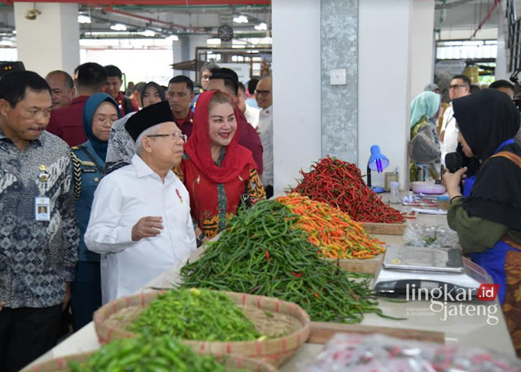 SEMARANG, Lingkarjateng.id – Wakil Presiden (Wapres) RI, Ma’ruf Amin blusukan ke Pasar Johar Semarang untuk memantau harga sembako dan kebutuhan pokok pada Kamis, 28 Desember 2023. Kunjungan Ma’ruf Amin didampingi sang istri Wury Ma’ruf Amin, Pj Gubernur Jawa Tengah Nana Sudjana dan Wali Kota Semarang Hevearita Gunaryanti Rahayu (Mbak Ita).