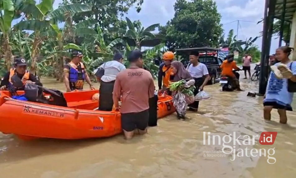 Tim BPBD Demak bersama relawan melakukan evakuasi warga yang terdampak banjir akibat meluapnya dan jebolnya tanggul Sungai Tuntang, Jumat (3/4/2026). Foto : BPBD Demak for Lingkar