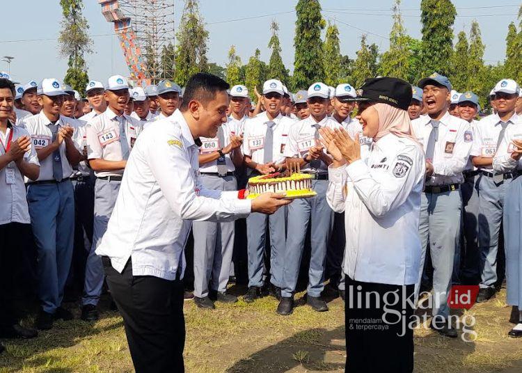 KENDAL, Lingkarjateng.id – Peserta seleksi calon pasukan pengibar bendera pusaka (paskibraka) memberikan kejutan ulang tahun kepada Bupati Kendal Dyah Kartika Permatasari di sela-sela pembukaan seleksi kesehatan dan parade di Stadion Utama Kebondalem Kendal, Rabu, 8 April 2026.