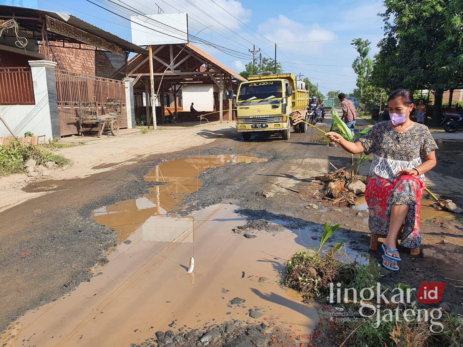 Seorang warga memancing ikan di kubangan Jalan Raya Tayu-Dukuhseti, Kabupaten Pati, Januari 2025 lalu. (Setyo Nugroho/Lingkarjateng.id)