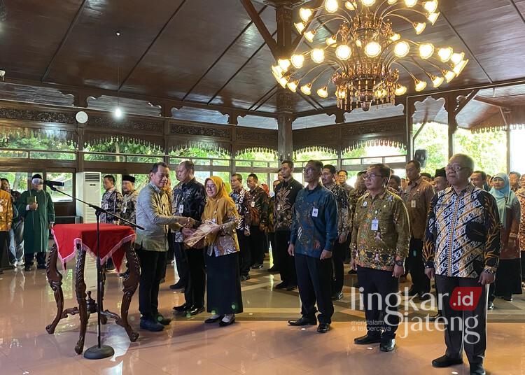 Bupati Kudus Sam’ani Intakoris saat menyerahkan surat keputusan (SK) pelantikan pejabat administrasi dan pejabat pengawas kepada salah satu ASN di Pendopo Kabupaten Kudus pada Selasa sore, 10 Juni 2025. (Nisa Hafizhotus S./Lingkarjateng.id)