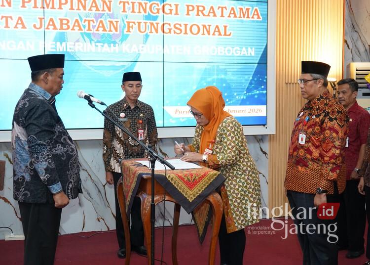 GROBOGAN, Lingkarjateng.id – Bupati Grobogan, Setyo Hadi, merotasi pejabat di lingkungan Pemerintah Kabupaten (Pemkab) Grobogan dalam pelantikan dua Pejabat Pimpinan Tinggi (JPT) Pratama serta tiga pejabat fungsional di Ruang Rapat Wakil Bupati Grobogan, Jumat, 27 Februari 2026.
