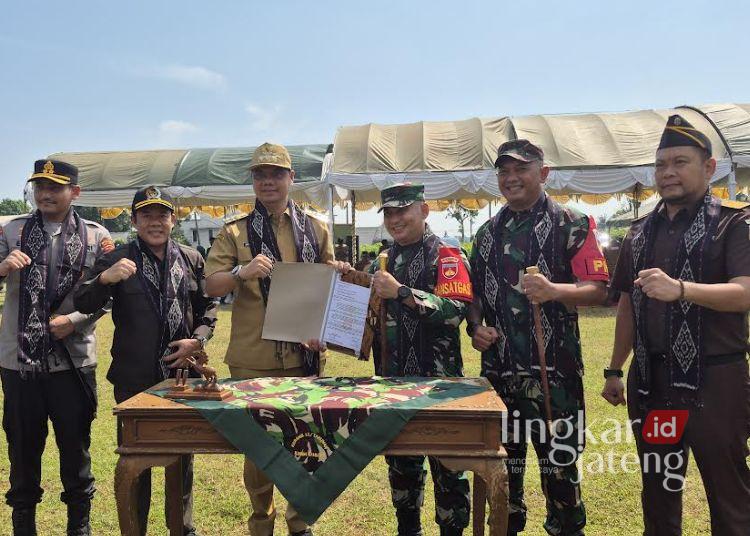 Pemberian surat penandatangan program pembangunan yang dilakukan Bupati Jepara, Witiarso Utomo dengan Komandan Kodim 0719/Jepara, Letkol Arm Khoirul Cahyadi yang didampingi jajaran Forkopimda di Lapangan Desa Kecapi pada Selasa 6 Mei 2025. (Muhammad Aminudin/Lingkarjateng.id)