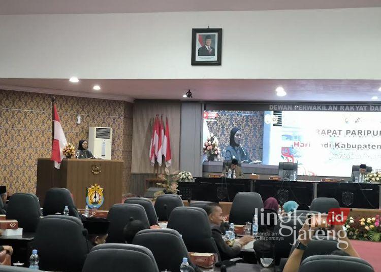 RAPAT: Bupati Kendal, Dyah Kartika Permanasari, saat menyampaikan sambutannya rapat paripurna istimewa dalam rangka Hari Jadi ke-420 Kabupaten Kendal pada Minggu, 27 Juli 2025 malam. (Arvian Maulana/Lingkarjateng.id)