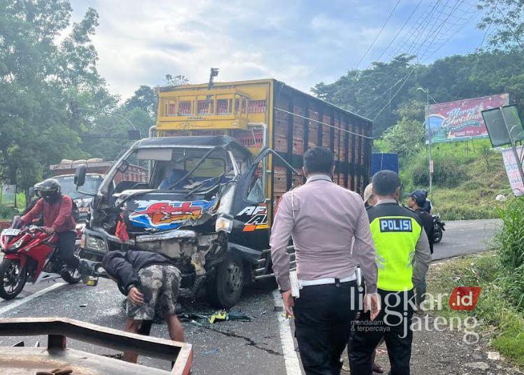 SALATIGA, Lingkarjateng.id – Kecelakaan lalu lintas kembali terjadi di jalan lingkar selatan (JLS) Salatiga tepatnya di sekitar simpang empat Kumpulrejo, Kecamatan Argomulyo, Senin, 15 Desember 2025. Kali ini, truk Izusu AD 8996 MO diketahui menghantam truk lain yang berjalan di depannya.