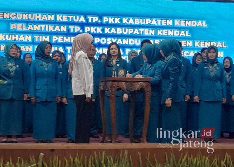 Penandatanganan SK pengurusan TP PKK periode 2025-2030 oleh Ketua TP PKK Kendal, Niken Larasati, dan disaksikan langsung oleh Bupati Kendal, Dyah Kartika Permanasari, di Gedung DPRD Kendal pada Rabu, 7 Mei 2025. (Arvian Maulana/Lingkarjateng.id)