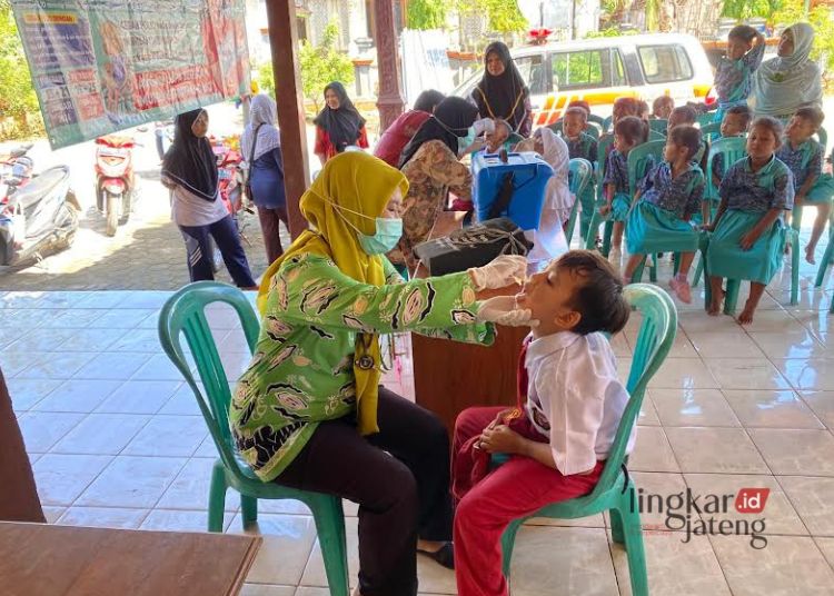 IMUNISASI: Petugas Dinas Kesehatan Kabupaten Blora memberikan vaksin polio kepada salah satu murid sekolah dasar. (Dinkes Blora/Lingkarjateng.id)