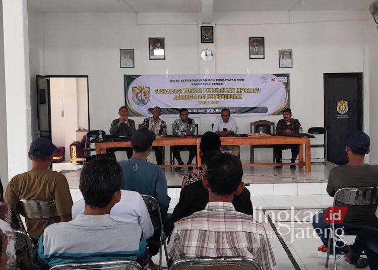 Sosialisasi pengelolaan informasi adminduk yang diselenggarakan Dinas Kependudukan dan Pencatatan Sipil (Disdukcapil) di Aula Balai Desa Gebang, Kecamatan Gemuh, Kabupaten Kendal pada Selasa, 28 April 2026. (Anik Kustiani/Lingkarjateng.id)