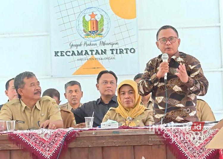 Wakil Ketua DPRD Kabupaten Pekalongan, Sumar Rosul, menyampaikan paparan penanganan banjir saat audiensi bersama warga terdampak di Kantor Kecamatan Tirto, Senin, 9 Februari 2026. (Fahri Akbar/Lingkarjateng.id)