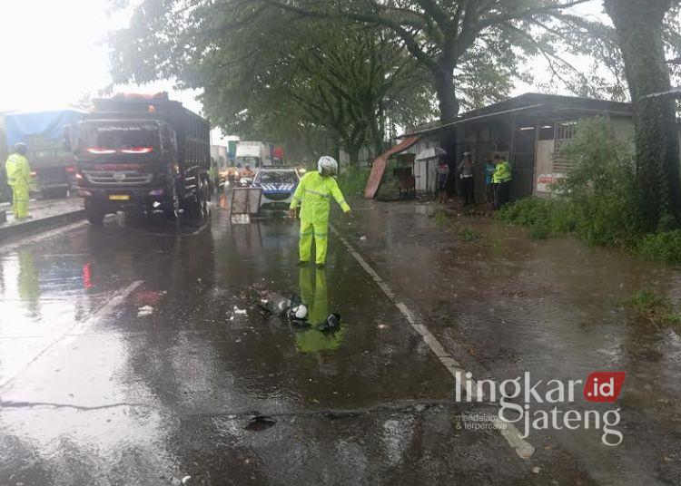Pada saat bersamaan, sebuah truk Mitsubishi Tronton Dump bernomor polisi H-1784-BJ yang dikemudikan Solikan (44) melaju dari arah belakang dan menabrak korban hingga terlindas.