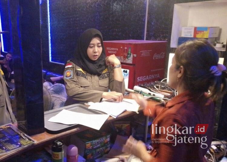 Petugas Satpol PP Rembang memperingatkan pelaku usaha kafe karaoke yang masih bandel buka saat bulan Ramadhan, Selasa malam, 24 Februari 2026. (Vicky Rio/Lingkarjateng.id)