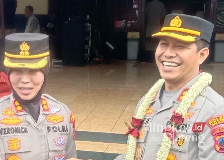Pejabat lama AKBP Veronica bersalaman dengan Kapolres Salatiga yang baru AKBP Ade Papa Rihi usai sertijab di Mapolres Kota Salatiga pada Rabu, 14 Januari 2026. (Angga Rosa/Lingkarjateng.id)
