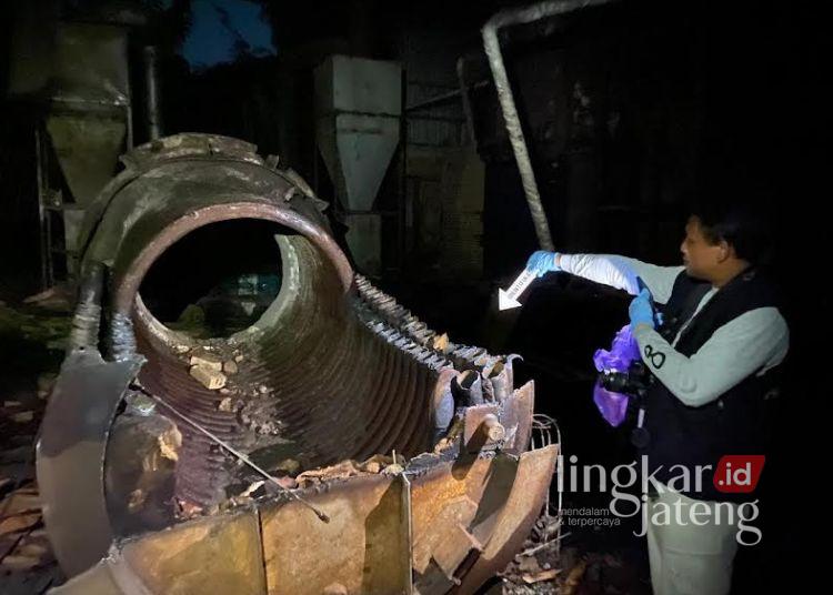 Anggota Polsek Kajen melakukan olah tempat kejadian perkara (TKP) di area Pabrik Triplek PT Kayu Alam Lestari, Desa Sabarwangi, Kecamatan Kajen, Kabupaten Pekalongan, usai kebakaran yang terjadi pada Minggu malam, 25 Mei 2025. (Dok. Polsek Kajen)