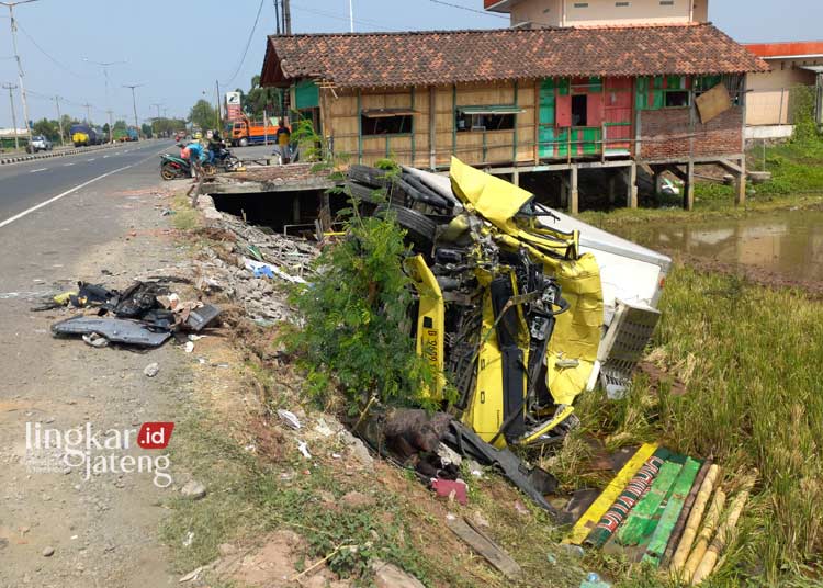 “Setelah nabrak warung itu, truknya nabrak bagian belakang truk (lain, red) yang lagi parkir di bahu jalan. Setelah nabrak, terus terjun ke sawah truknya,” ungkapnya.