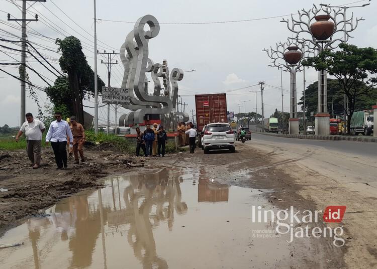 Kondisi jalan area perbatasan Kendal-Kota Semarang di Desa Sumberejo, Kecamatan Kaliwungu, Kabupaten Kendal, banyak lumpur yang membahayakan keselamatan pengendara, Senin, 12 Januari 2026. (Anik Kustiani/Lingkarjateng.id)