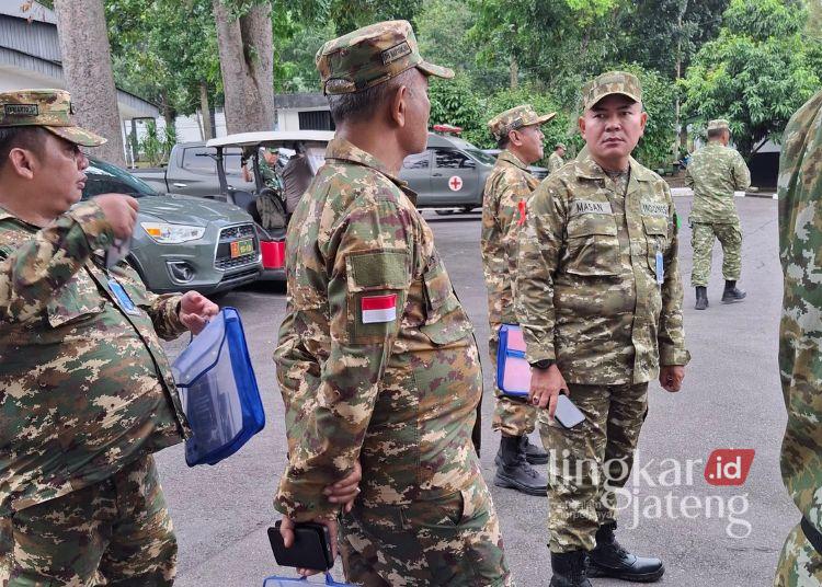 Mereka datang menggunakan berbagai kendaraan, baik berpelat dinas maupun pribadi, dengan tampilan yang seragam mengenakan pakaian Komponen Cadangan (Komcad) berwarna hijau loreng.