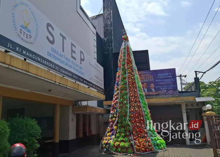 POTRET: Pohon natal yang terbuat dari limbah sampah oleh Gereja Isa Almasih Jemaat Pringgading, Kecamatan Semarang Tengah, Kota Semarang, Rabu, 24 Desember 2025. (Syahril Muadz/Lingkarjateng.id)