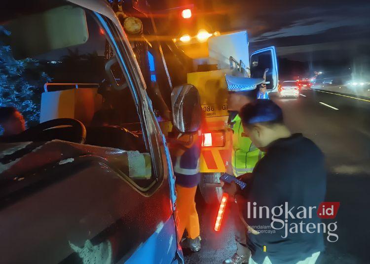 OLAH TKP : Petugas Satlantas Polres Salatiga memeriksa mini bus dan lokasi kejadian kecelakaan tunggal di jalan tol Semarang - Solo, KM 453 jalur B, Kecamatan Sidorejo, Salatiga, Kamis malam, 3 April 2025. (Dok. Polres Salatiga)