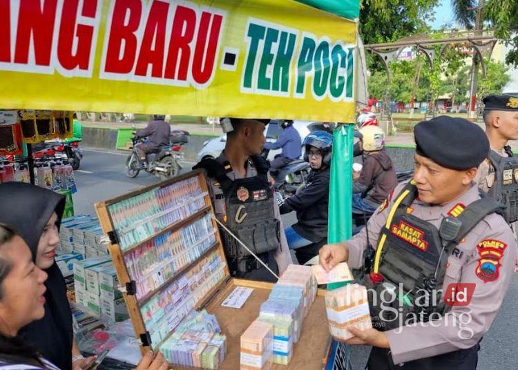 Petugas Polres Kudus saat melakukan pengecekan keaslian uang yang ada pada jasa tukar uang baru di sekitar Alun-alun Simpang Tujuh Kudus. (Nisa Hafizhotus S/Lingkarjateng.id)