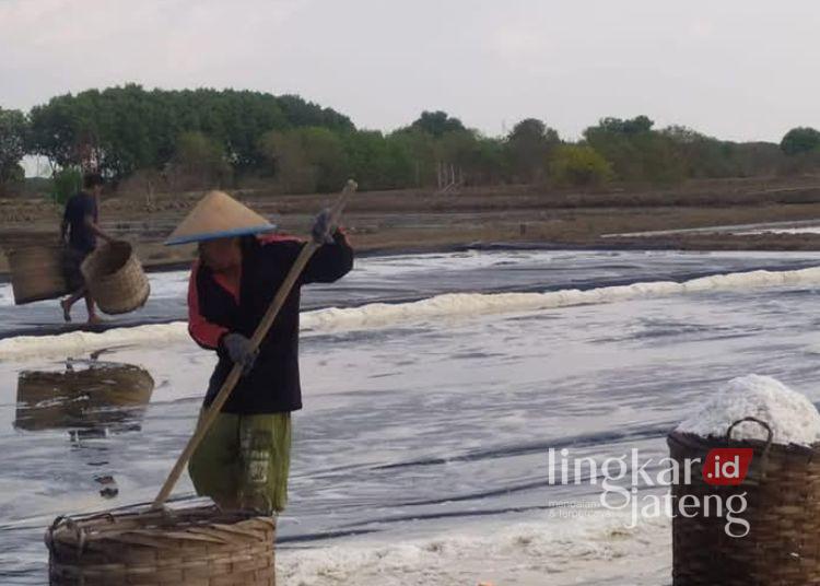 ILUSTRASI: Petambak garam di Kecamatan Kedung, Kabupaten Jepara saat memanen garam. (Tomi Budianto/Lingkarjateng.id)