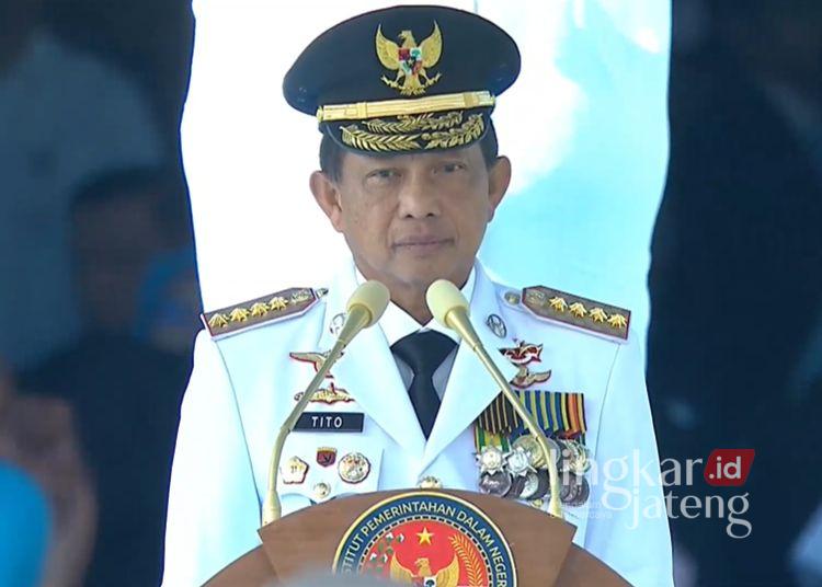 Menteri Dalam Negeri Tito Karnavian menyampaikan sambutan dalam acara pelantikan Pamong Praja Muda/Purna Praja IPDN Angkatan XXXII di Kampus IPDN Jatinangor, Kabupaten Sumedang, Jawa Barat, Senin, 28 Juli 2025. (YouTube Humas IPDN/Lingkarjateng.id)