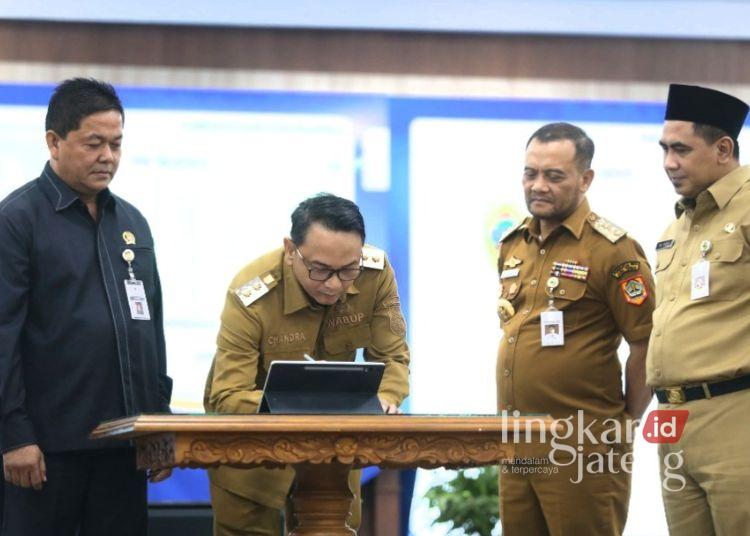 Ketua DPRD Kabupaten Pati Ali Badrudin saat mendampingi Plt Bupati Pati Risma Ardhi Chandra mendatangani pakta integritas antikorupsi. (Dok. For Lingkarjateng.id)