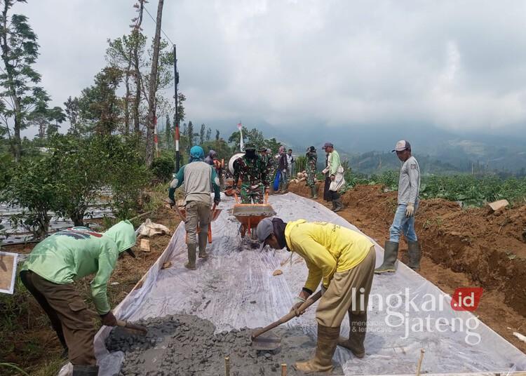 Pembangunan jalan desa dalam program TMMD Sengkuyung Tahap II Tahun Anggaran 2026 di Desa Bringinsari, Kecamatan Sukorejo, Kabupaten Kendal, Kamis, 23 April 2026. (Lingkarjateng.id)