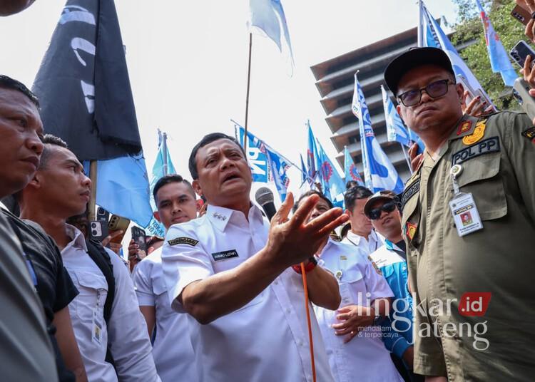 Gubernur Jawa Tengah, Ahmad Luthfi, saat menemui massa buruh di Halaman Kantor Gubernur Jateng sesaat setelah pengumuman kenaikan UMP 2026, Rabu, 24 Desember 2025. (Humas Pemprov Jateng/Lingkarjateng.id)