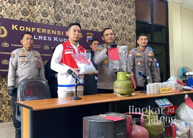 Polres Kudus menunjukkan barang bukti kasus praktik ilegal penyuntikan LPG dalam konferensi pers di Mapolres Kudus, Kamis, 5 Maret 2026. (Nisa Hafizhotus S./Lingkarjateng.id)