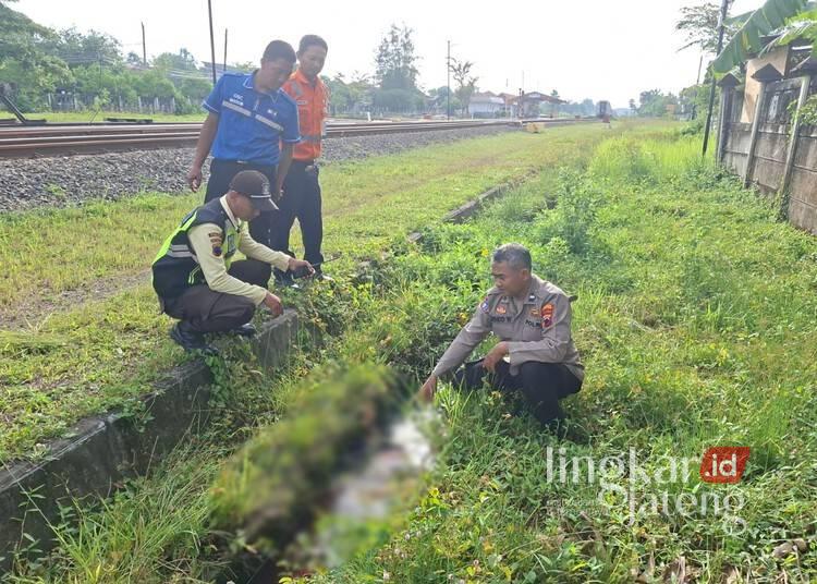Petugas kepolisian saat melakukan olah TKP di perlintasan rel KM 31+0 jalur hulu Gubug–Kedungkati, wilayah Desa Kuwaron, Kecamatan Gubug, Kabupaten Grobogan, Senin pagi, 29 Desember 2025. (Humas Polres Grobogan/Lingkarjateng.id)