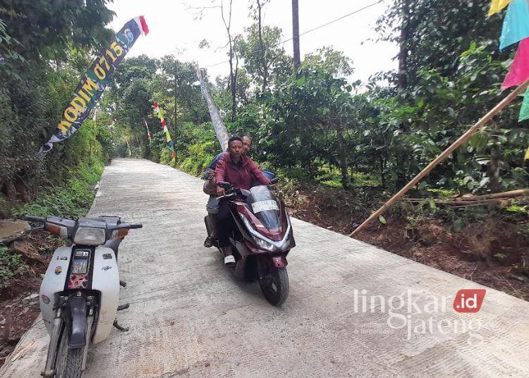 Warga melintas di jalan cor di Desa Gedong, Kecamatan Patean, Kabupaten Kendal, Sabtu, 7 Maret 2026.  (Anik Kustiani/Lingkarjateng.id)