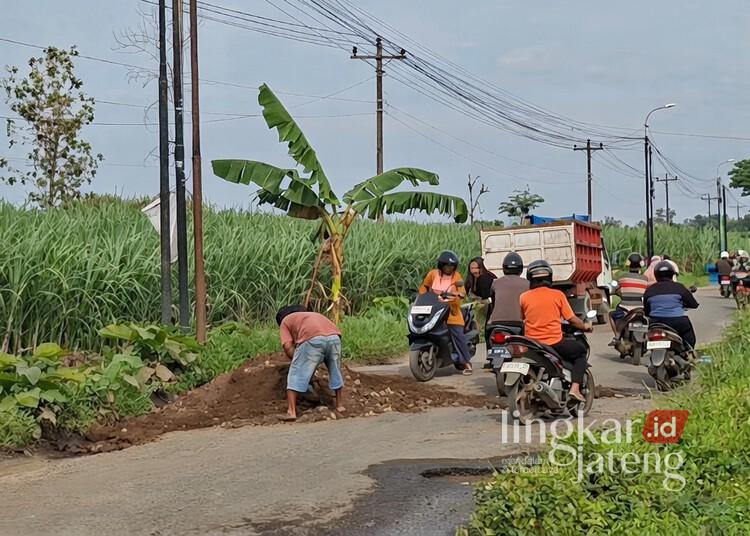 Warga Desa Wonorejo, Kecamatan Tlogowungu, Kabupaten Pati, melakukan aksi penanaman pohon pisang di ruas jalan kabupaten setempat yang rusak sebagai bentuk protes belum adanya perbaikan dari pemerintah daerah setempat, Minggu, 22 Februari 2026. (LingkarJatengGroup Network/Lingkarjateng.id)