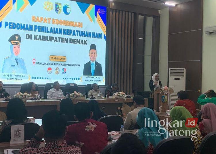 Sementara itu, Bupati Demak Eisti’anah dalam sambutannya menyampaikan bahwa rakor tersebut memiliki arti penting dalam memperkuat pemahaman dan implementasi pedoman penilaian kepatuhan HAM di lingkungan pemerintah daerah.