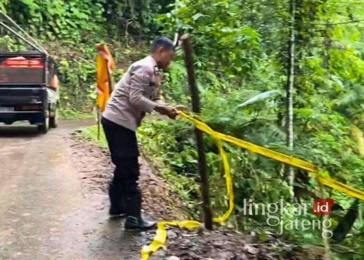 Petugas Bhabinkamtibmas memasang garis polisi di tepi jalan jalur Doro–Petungkriyono Pekalongan yang terdampak longsor dan berbatasan langsung dengan jurang, Sabtu, 27 Desember 2025. (Dok. Polsek Petungkriyono/Lingkarjateng.id)