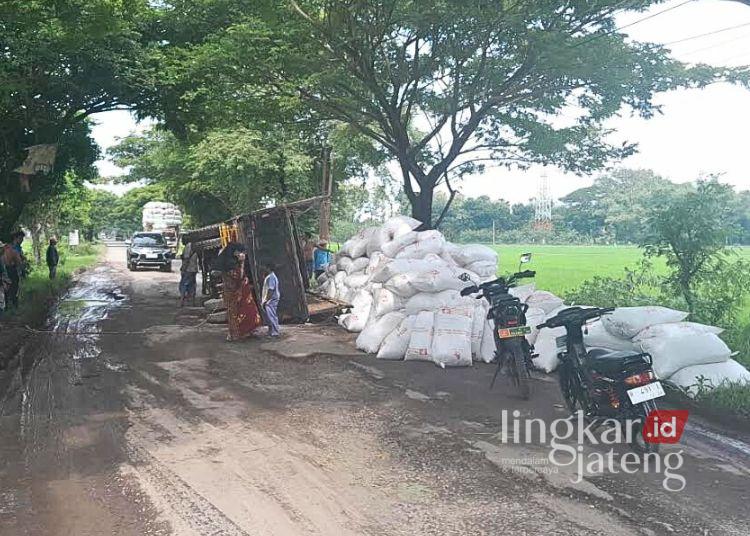 Truk yang dikemudikan Mustofa terguling saat melewati lubang-lubang di Jalan Raya Winong-Gabus hingga muatannya kocar-kacir.