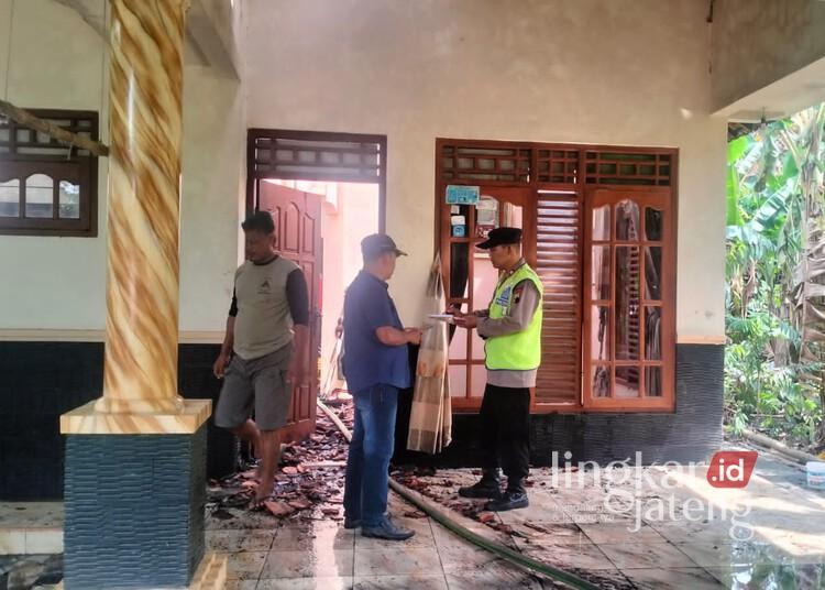 Anggota Polsek Wedarijaksa meninjau rumah Warga Desa Panggungroyom, Kecamatan Wedarijaksa, Kabupaten Pati, yang terbakar pada Rabu, 9 April 2025. (Setyo Nugroho/Lingkarjateng.id)
