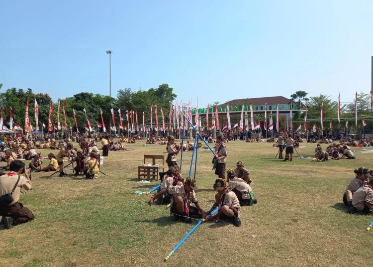 Ratusan pelajar lengkap dengan seragam dan atribut pramuka mengikuti lomba pioneering yang diselenggarakan Kwaran Rembang.