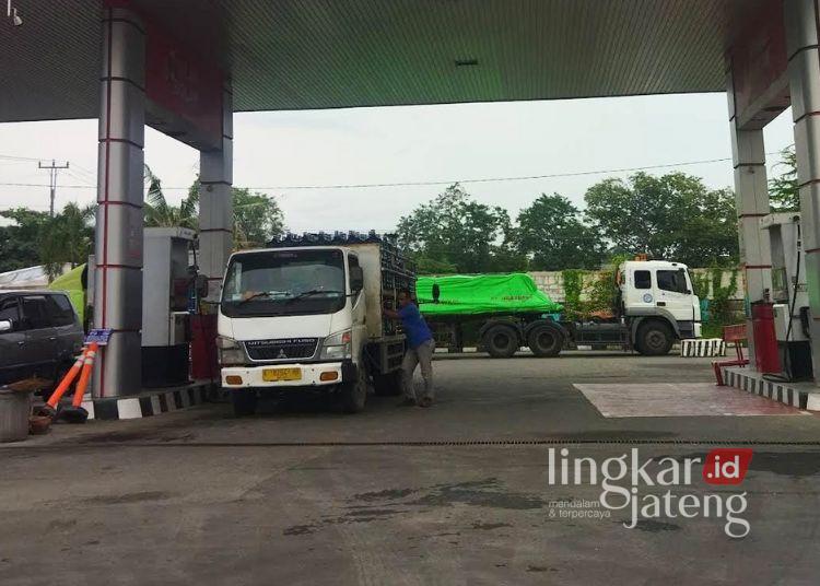 POTRET: Sejumlah kendaraan berat antre pengisian solar di salah satu SPBU Kabupaten Pati. (Lingkarnews Network)
