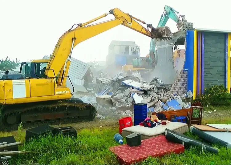 Alat berat membongkar rumah warga di kawasan Lorok Indah, Kabupaten Pati, pada Februari 2022 lalu. (Tangkapan layar YouTube Rakyat Reggae Musik/Lingkarjateng.id)
