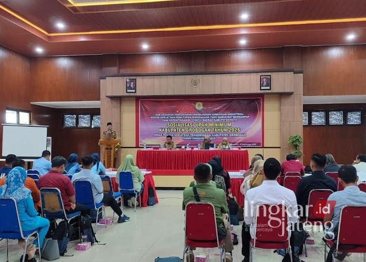Disnakertrans Kabupaten Grobogan saat menggelar kegiatan Sosialisasi Upah Minimum Kabupaten Grobogan Tahun 2026, Senin, 12 Desember 2025. (Ahmad Abror/Lingkarjateng.id)