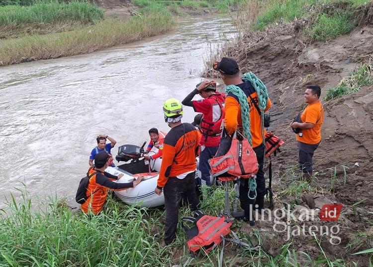 Tim BPBD Kendal melakukan pencarian warga yang hanyut di Sungai Bodri turut Desa Tegorejo, Kecamatan Pegandon, Kabupaten Kendal, Sabtu, 7 Februari 2026. (Anik Kustiani/Lingkarjateng.id)