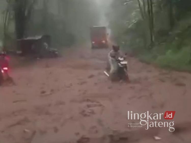 Air yang bercampur lumpur tersebut diduga berasal dari aktivitas galian C di wilayah Desa Pagergunung, Kecamatan Pageruyung yang terbawa air hujan hingga meluber ke jalan.