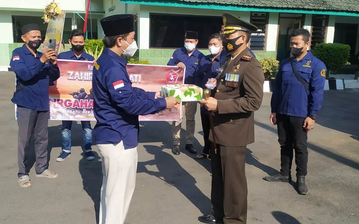 PATI, Lingkarjateng.id – Dalam memperingati HUT TNI ke 76, Zahir Mania Kabupaten Pati memberikan kue kejutan ulang tahun kepada Komandan Kodim, Letkol Czi Adi Ilham Zaman di halaman Kodim 0718 Pati, Selasa (5/10/21). Kue tersebut merupakan inisiatif dari Ketua Zahir Mania Pati.
